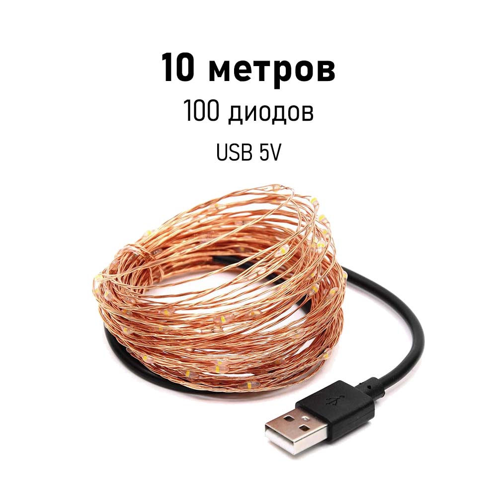 Нить Роса медь, 10 м х 100 диодов от USB, белый