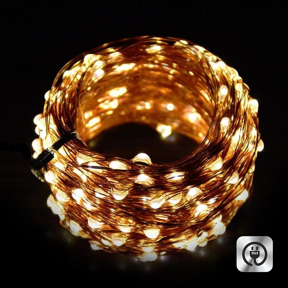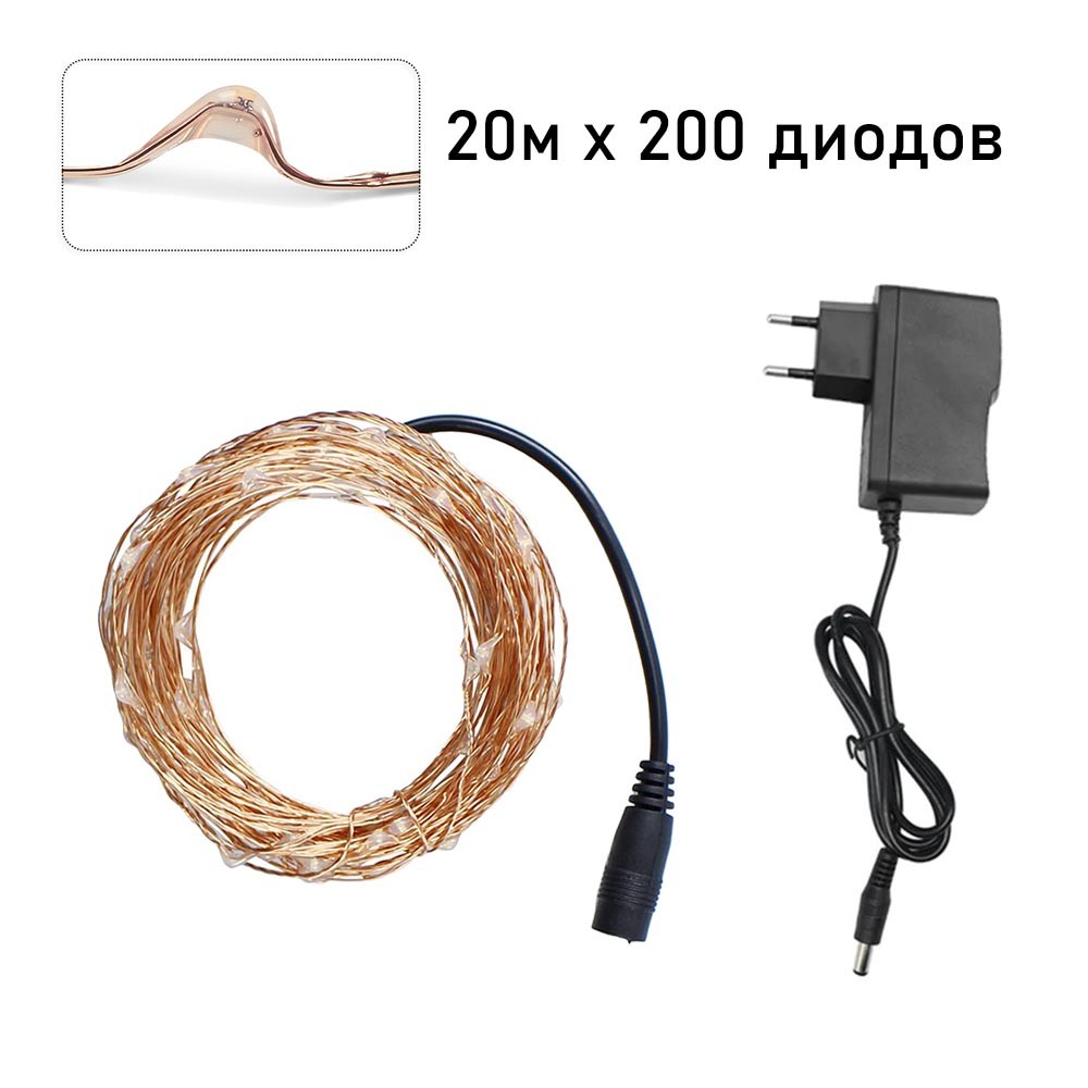 Нить "Роса" медь, 20 м х 200 диодов, от сети, теплый белый