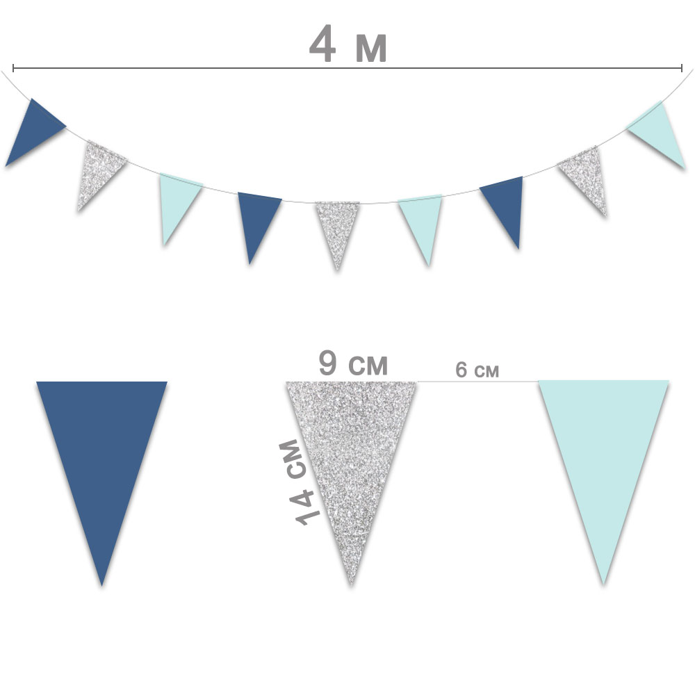 Гирлянда-вымпел 9 х 14 см голубой+серебро+синий 4 м