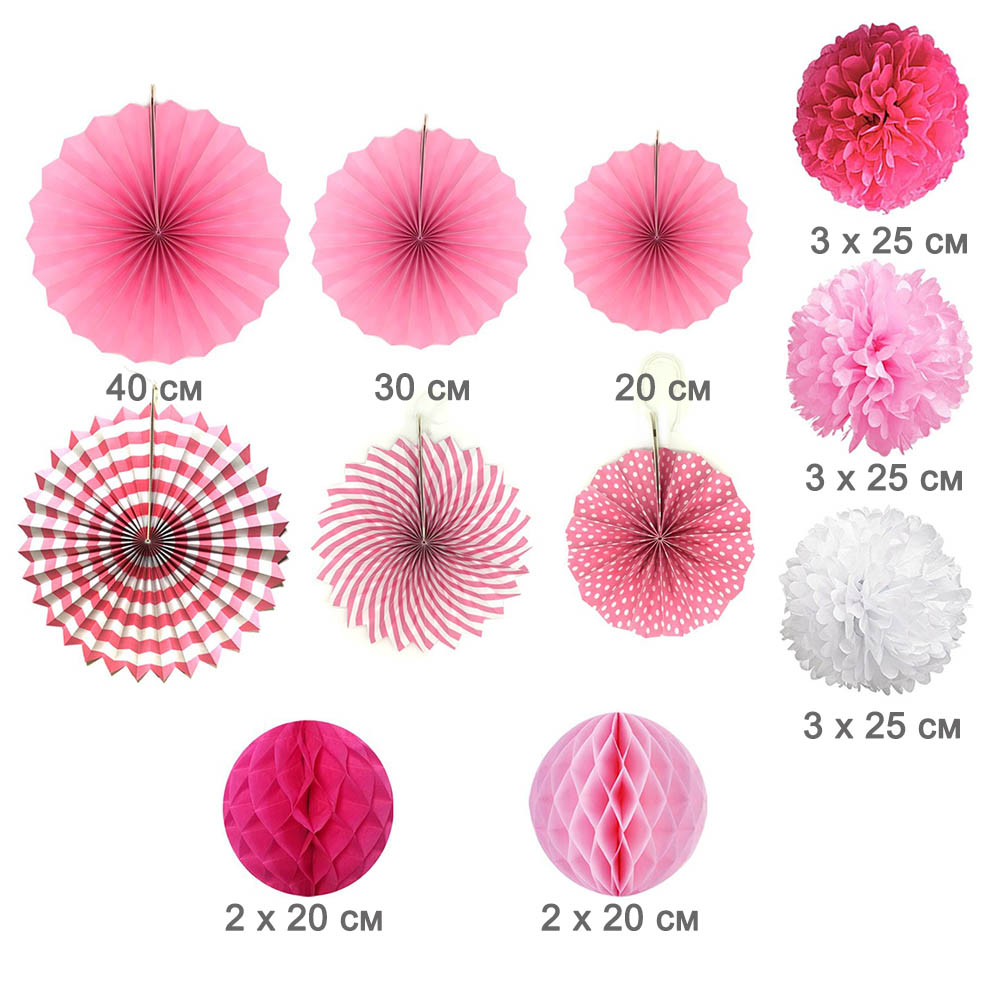 Готовый комплект из бумажных фантов, помпонов и шаров сот, можно применять в качестве декорирования фотозоны к празднику. Подвесные фонарики и шары соты, раскрываются одним движением. Бумажные помпоны необходимо расправить.  Готовый набор доставляется в сложенном виде. Можно использовать несколько раз.