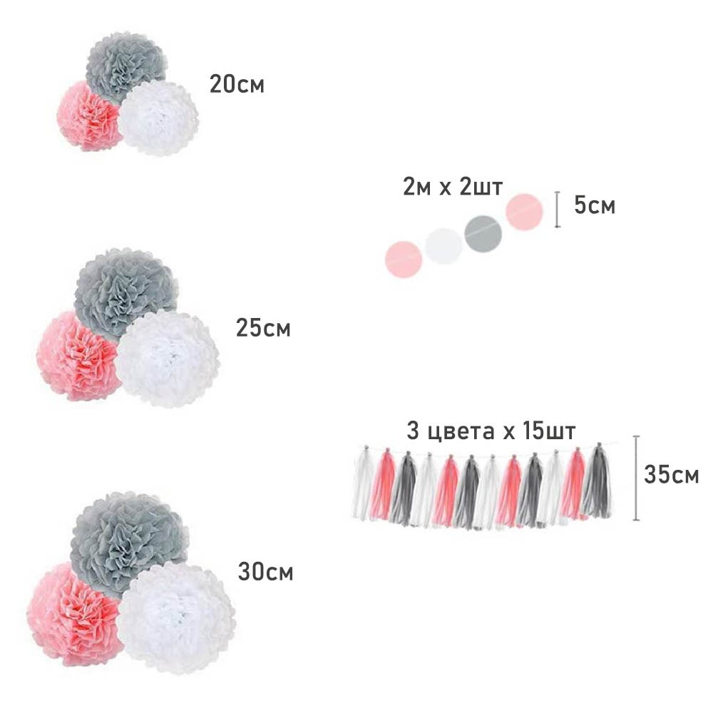 Гирлянда тассел 2 м х 35 см х 15 шт (белый + розовый + серый);