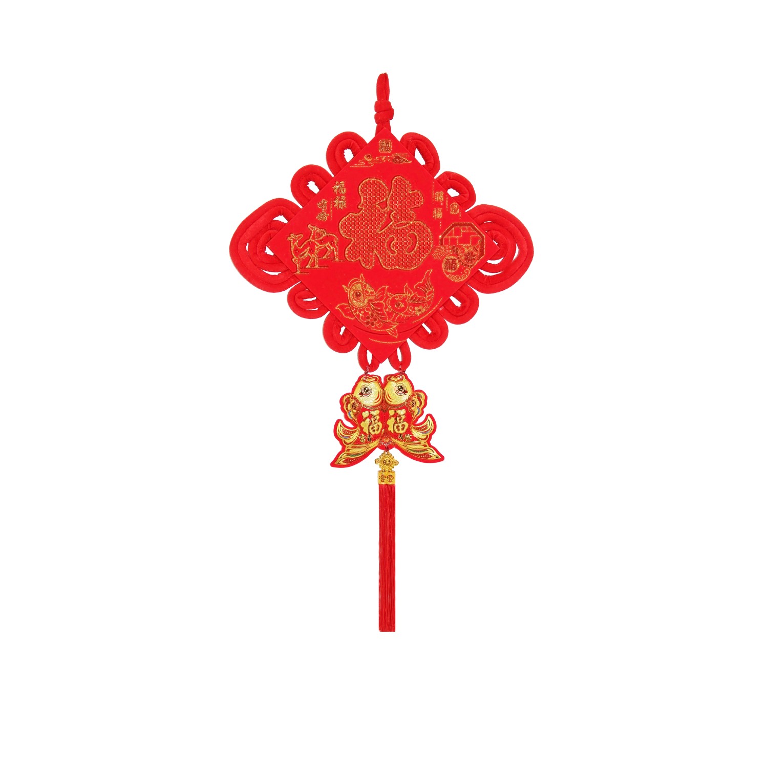 Традиционный китайский узел в форме ромба с символичным дизайном. Яркое сочетание красного бархата и золотых элементов создает эффектный акцент в интерьере.