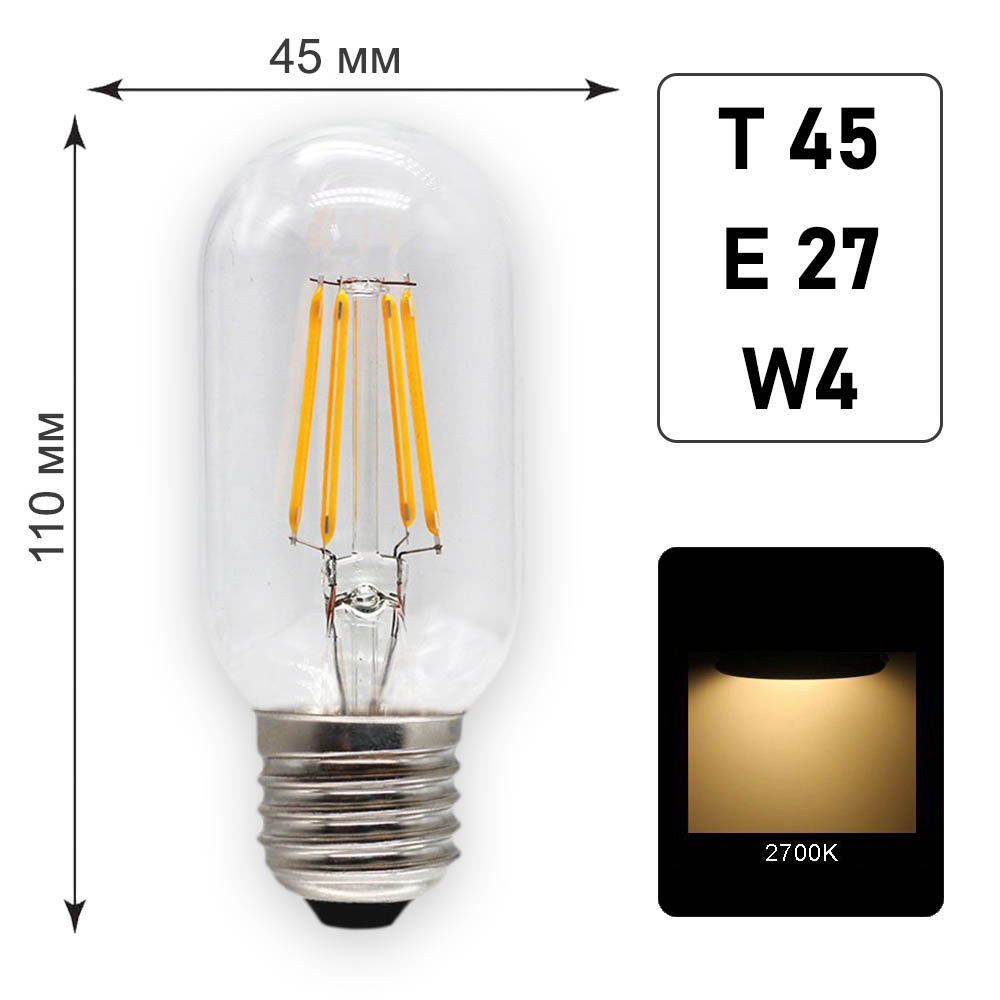 Лампа светодиодная Т45 E27 W4 K2700 – филаментный источник с потребляемой мощностью 4Вт. Тепловой диапазон испускаемого света 2700К. Гарантия от производителя – 20 000 часов.