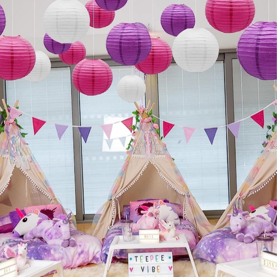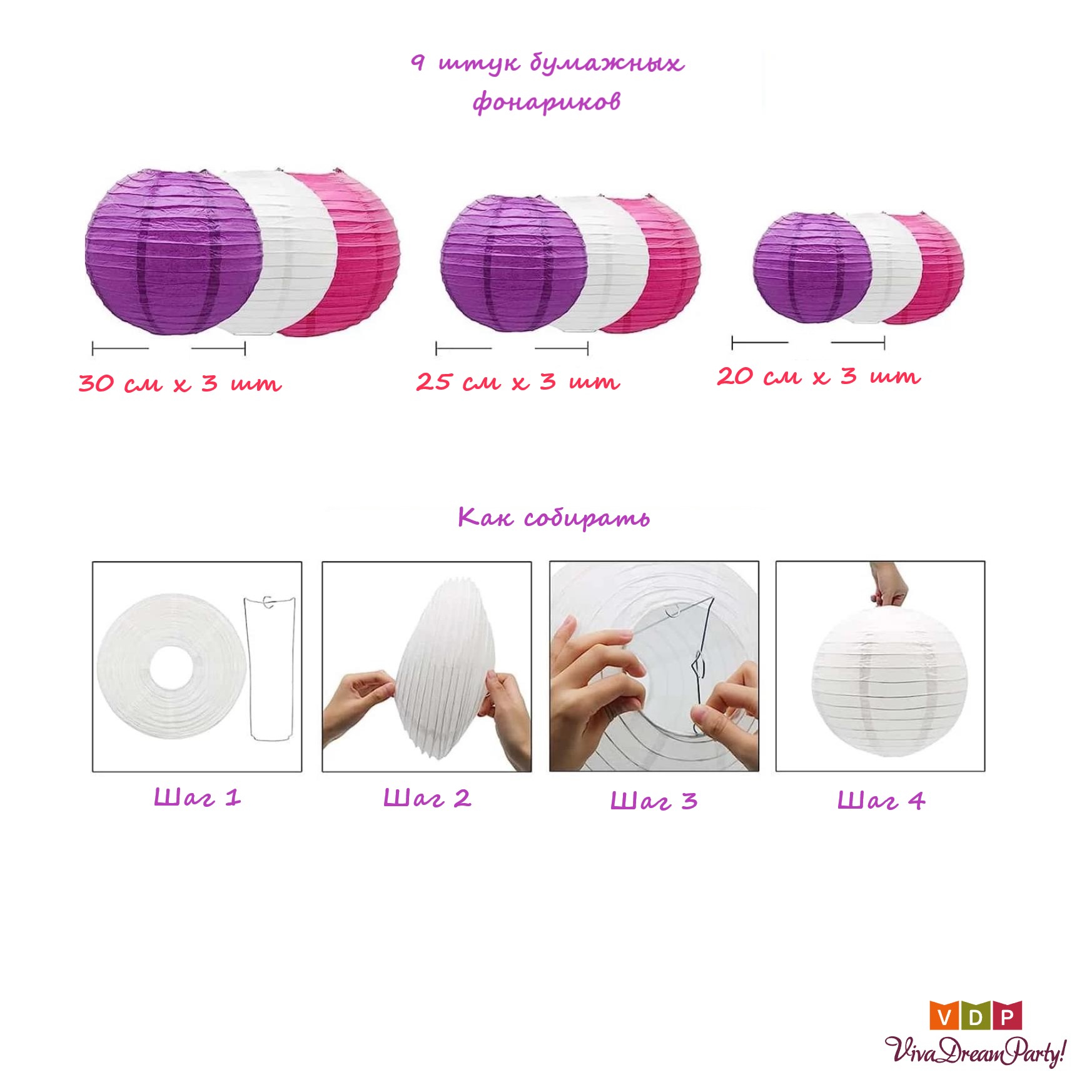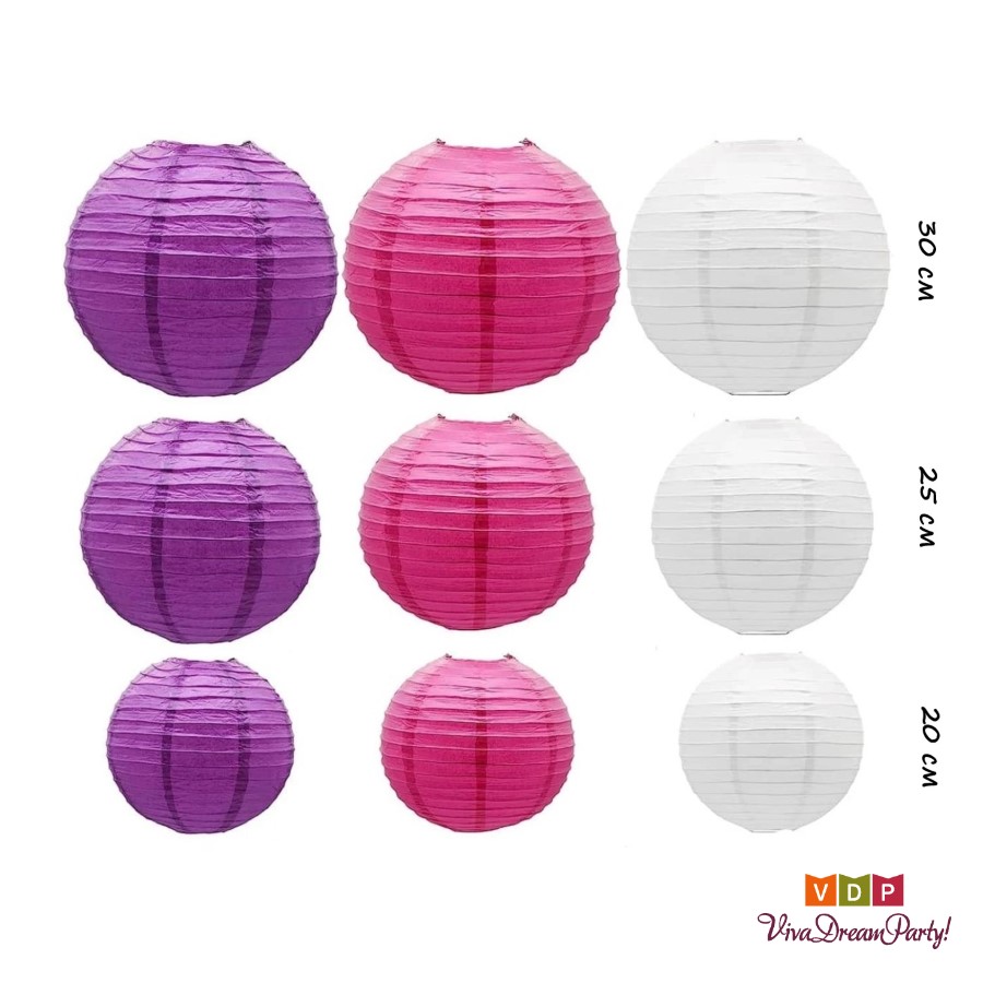 Набор подвесные фонарики 9 шт, белый+малиновый+сиреневый