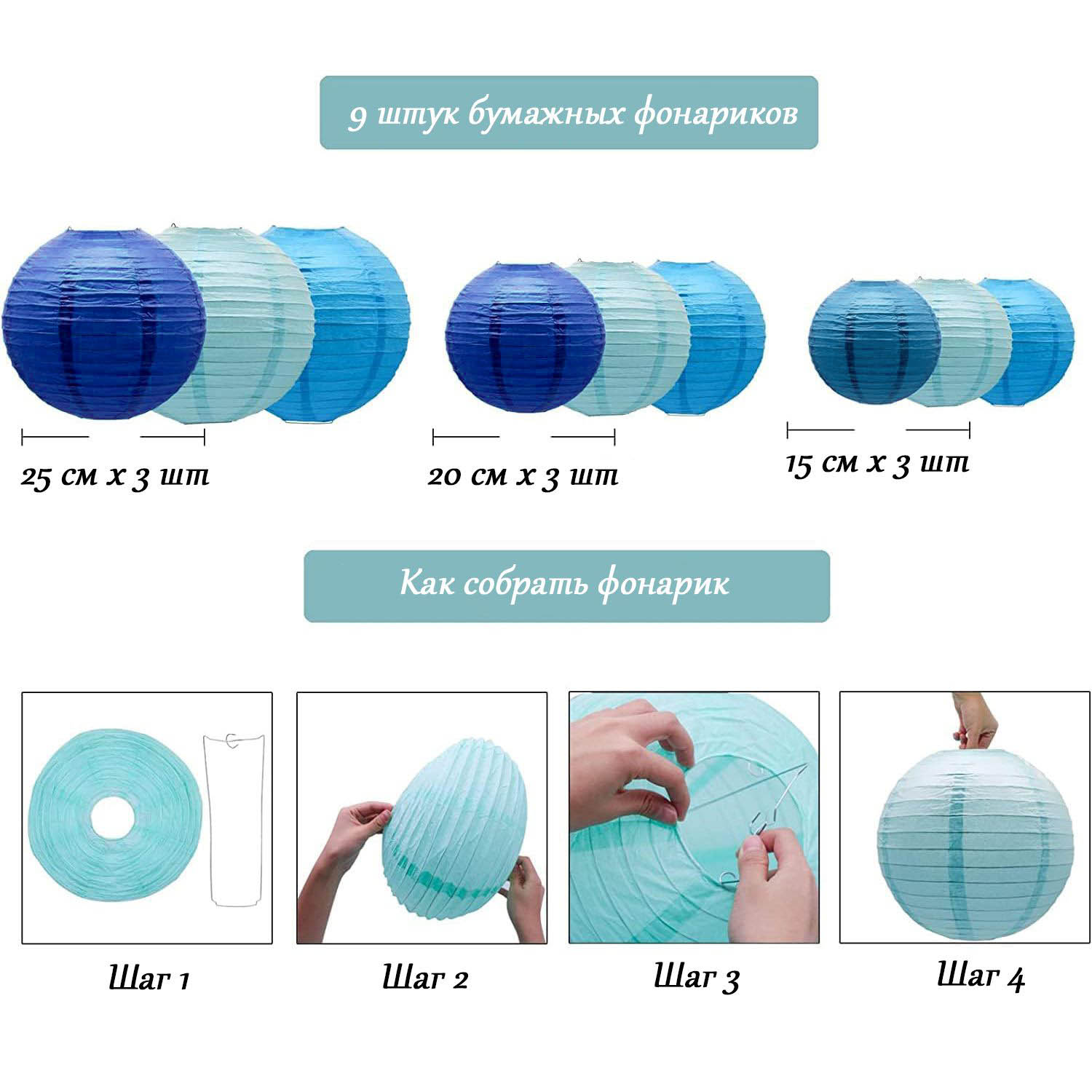 Набор подвесные фонарики 9 шт, синий+т.синий+голубой