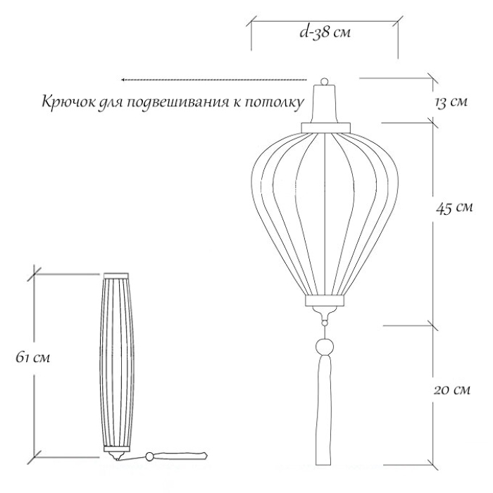 Диаметр фонарика составляет 38 сантиметров, что позволяет ему гармонично вписаться в интерьер любого помещения. Кисточка добавляет фонарику особую изюминку и придаёт ему уникальный вид.