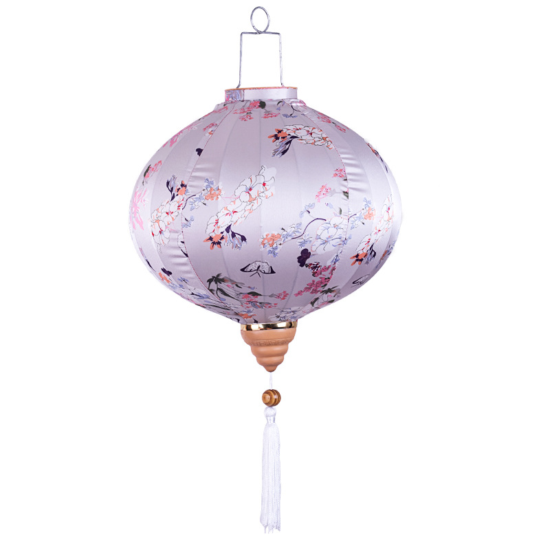 Коллекция подвесных фонарей ручной работы. Конструкция из шелкового полотна с цветочным орнаментом, металлического каркаса и подвесной системы. Модель в серой цветовой гамме.