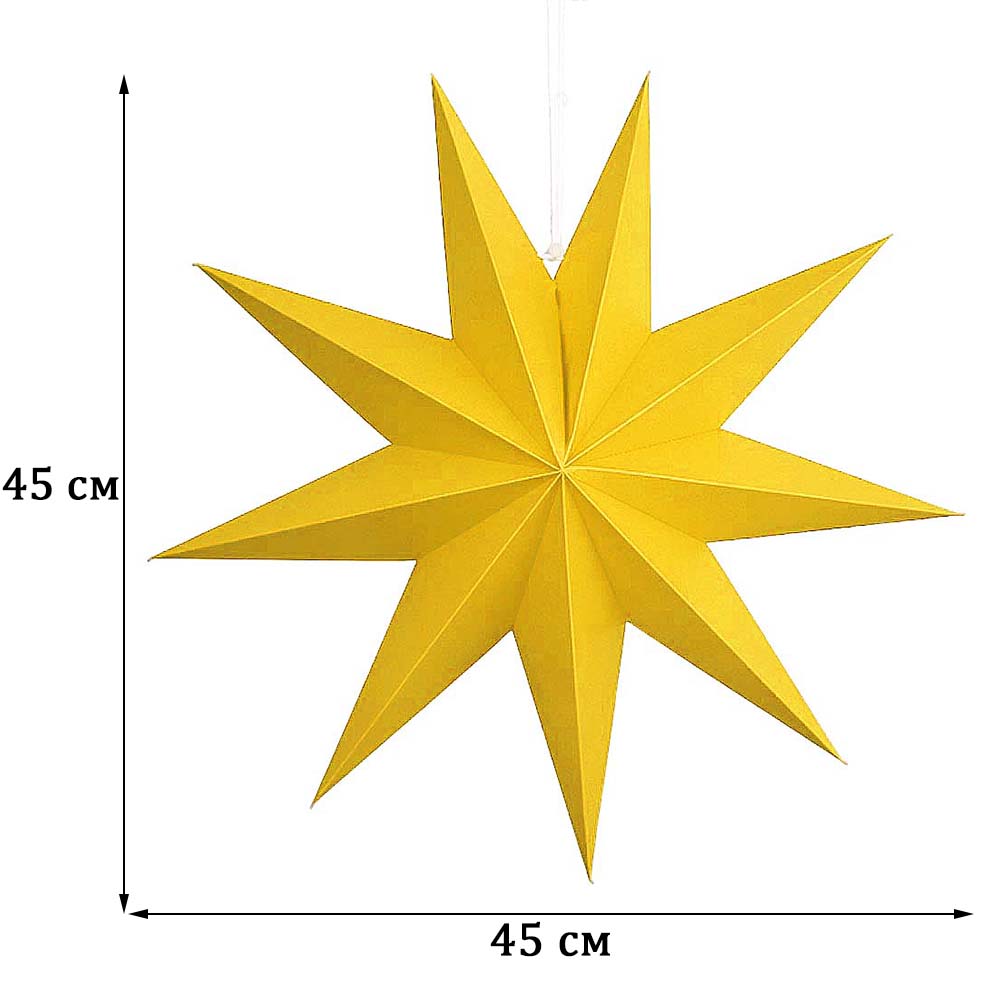 Объёмная девятиконечная звезда 45 см — декоративный элемент для интерьера и праздничного оформления. Лёгкая интерьерная звезда из картона хорошо держит форму и создаёт выразительный объём. Поставляется в сложенном виде, в комплекте шнур для фиксации объёма и подвеса.