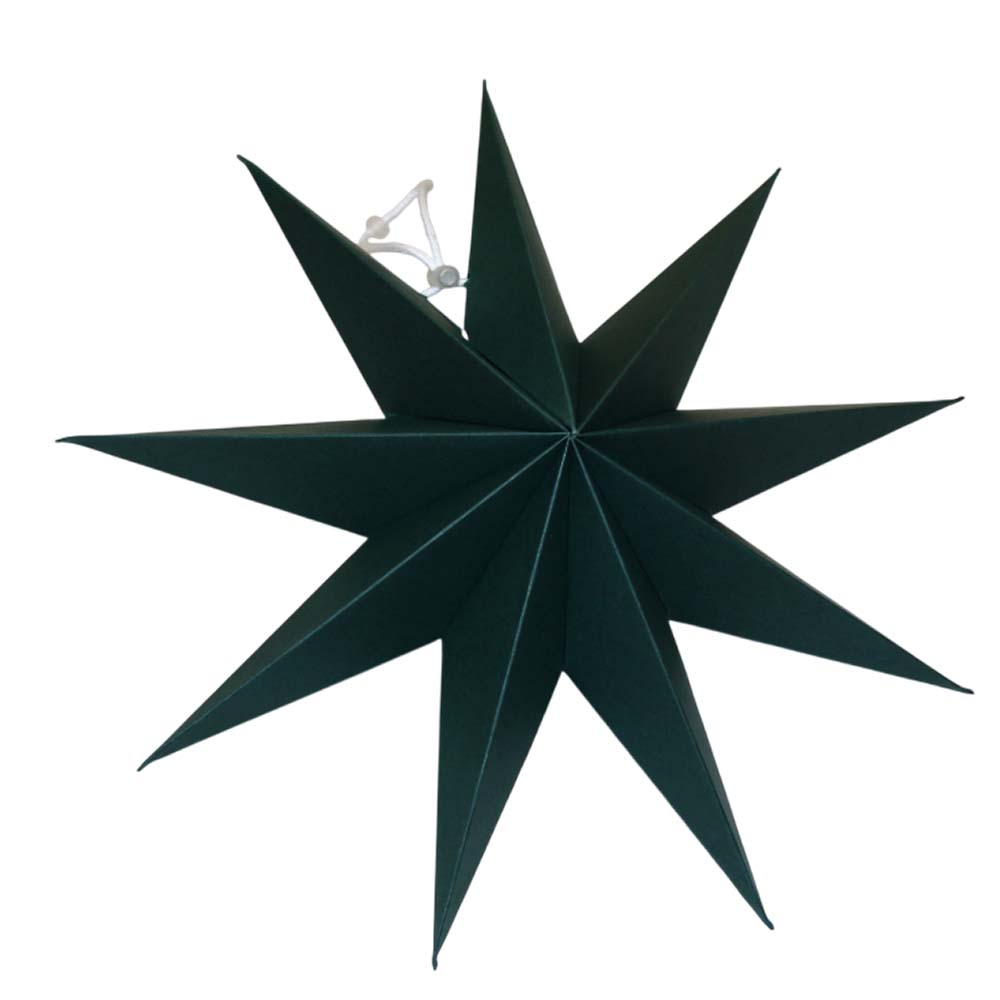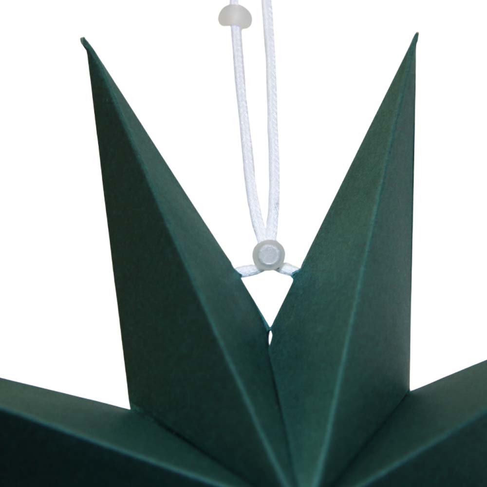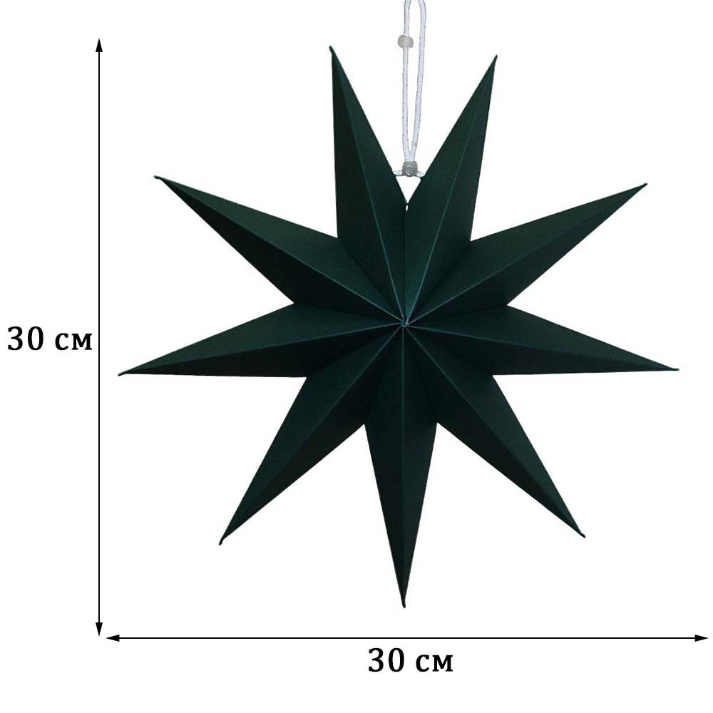 Объёмная декоративная звезда из картона диаметром 30 см с 9 лучами. Оснащена встроенным шнурком для подвешивания. Поставляется в компактном сложенном виде и быстро собирается: специальный шнурок при затягивании придаёт изделию объём и фиксирует форму. После сборки звезда остаётся устойчивой без дополнительных креплений и может использоваться многократно.