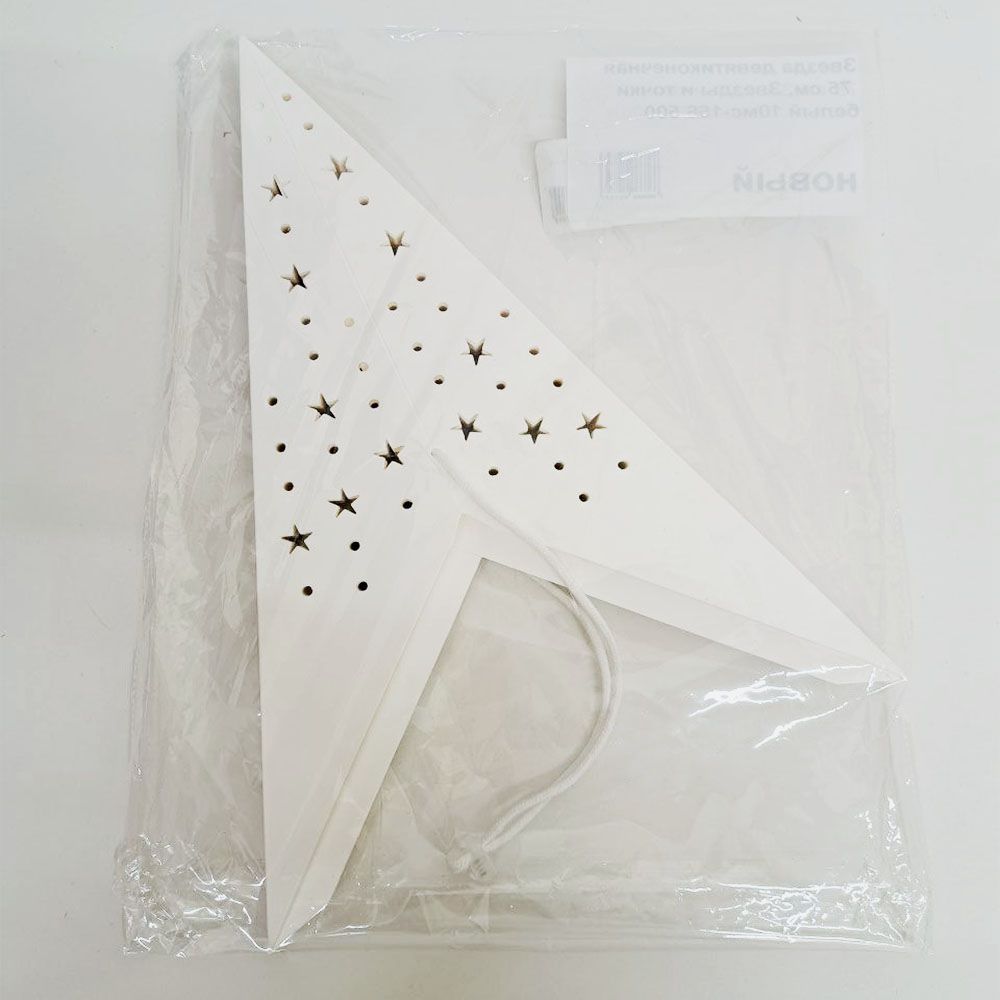 Звезда девятиконечная диаметром 75 см, изготовлена из картона с перфорацией в виде точек и мелких звезд.